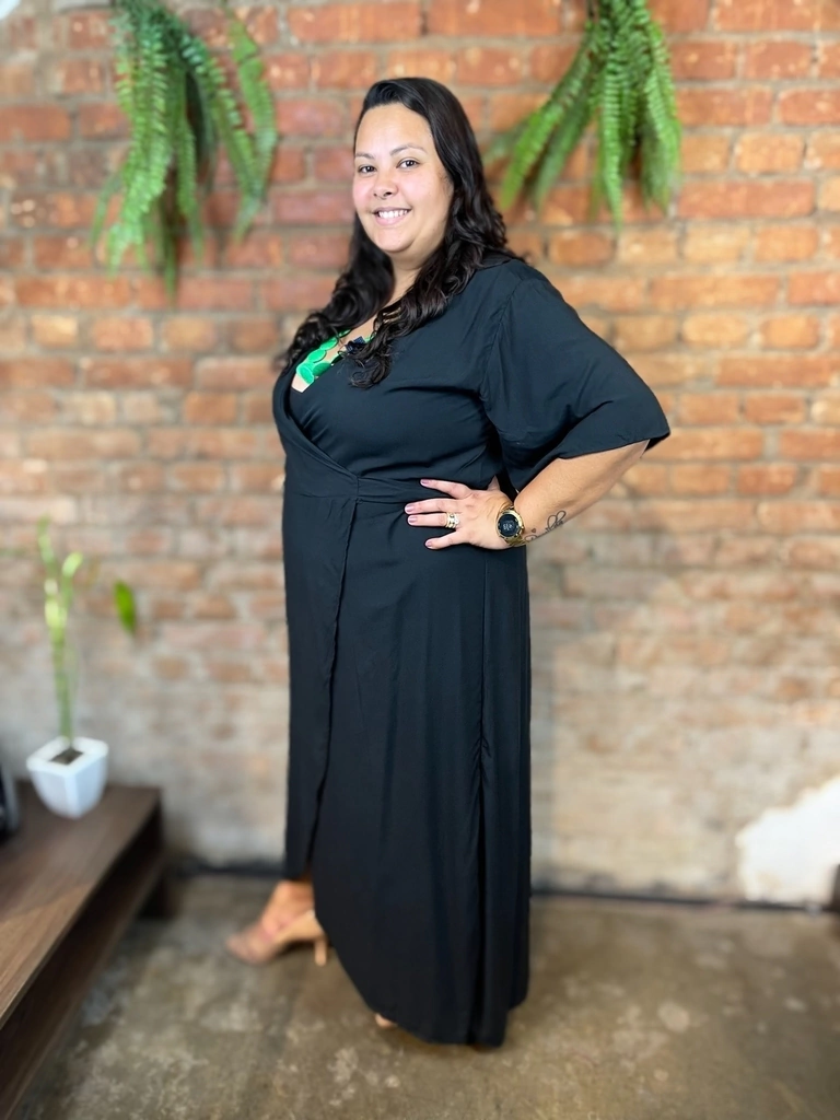 O VESTIDO ENVELOPE LONGO tem comprimento longo, transpasse na cintura e acabamento e costura na mesma cor do tecido. O nosso vestido envelope possui um tecido encorpado que não fica transparente, e para garantir ainda mais conforto e segurança.